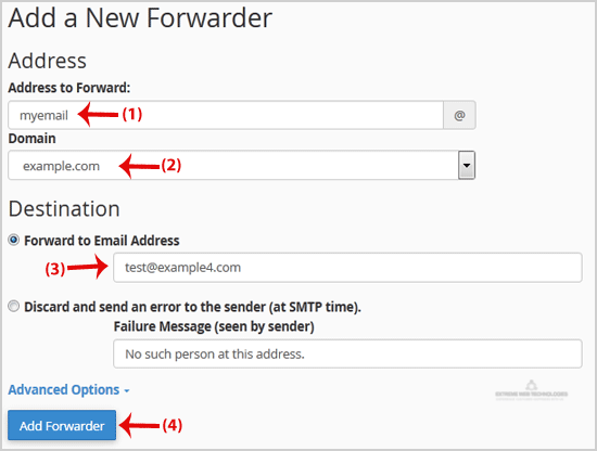 Step 3: On the "Add a New Forwarder" page you will see the "Address to forward:" field. If you want to forward your myemail@example.com to your custom e-mail address, enter "myemail" (without the quotes) in the "Address to forward" field, and should you have multiple domains, select the appropriate one from the domain drop-down list.